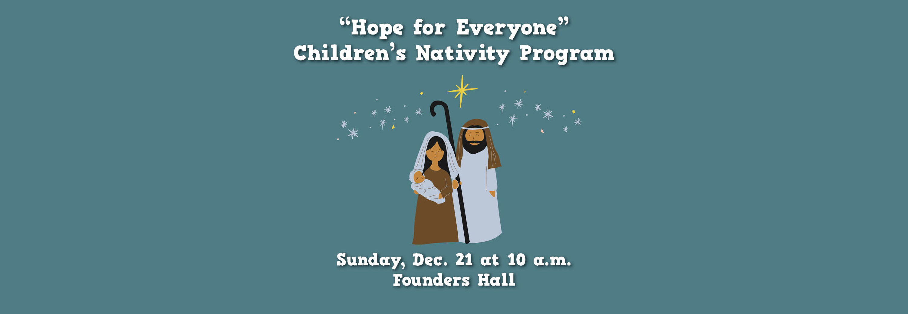 Our Children's Nativity Program, "Hope for Everyone," will take place Sunday, Dec. 21, at 10 a.m. in Founders Hall. There will be two worship services as usual that day, but no Sunday School will be held. Instead, we encourage everyone to attend this pageant. All children - preschool and older - are encouraged to participate. Interested? Contact Lesley at lesleyellison@parkwayheights.org. Two rehearsals will be held.